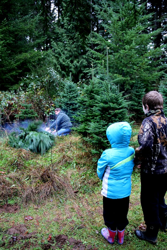 I suppose it isn't as exciting for the kids when we just walk up past the front yard instead of going to a tree farm somewhere. We head out in our sweat pants, double check to make sure the tree we tagged is indeed "the one", and the Farmboy cuts it down in one quick swoop of his chainsaw.